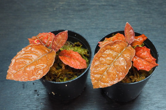 ベルベット感のある暗色の丸葉を展開する。生長に伴い葉はやや細くなり主脈付近に蛍光色がのる。