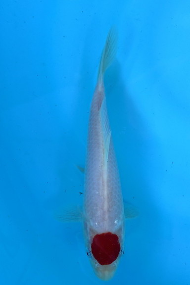 丹頂紅白、頭部の丸点が美しく、体色の白地も非常に美しい個体。