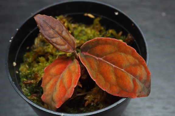 ベルベット感のある暗色の丸葉を展開する。生長に伴い葉はやや細くなり主脈付近に蛍光色がのる。