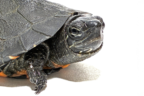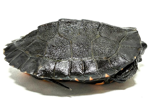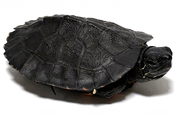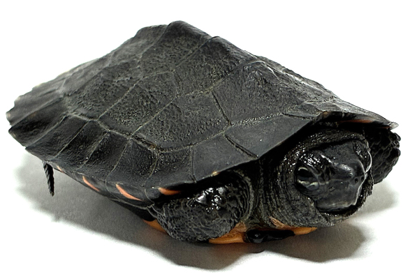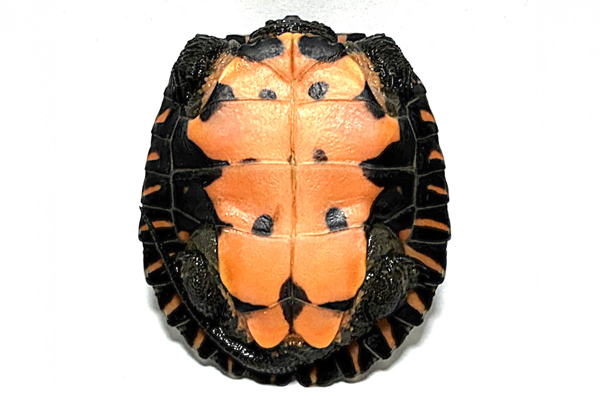 雄は甲長10〜18pですが、雌はより大きくなり20〜25pまで成長します(最大甲長は29.8pとされています)。 甲羅はドーム状に盛り上がり、椎甲板と助甲板にはキールが入りますが、後者は弱く、成体ではほぼ目立たなくなります。背甲は黒色ですが、幼体時の腹甲は鮮やかな朱色〜橙色です(成長するにつれ色は薄れていきます)。 頭部や四肢、尾部は黒褐色で幼体時は灰白色〜黄白色の細いストライプ模様が数本入りますが、成長にともない雌雄ともにメラニズム(黒化)を起こすものは少なくありません(頭部が大きく発達するものもいます。特に野生個体の雌に多く見られます)。 また、稀に雄では亜成体以降に頭部や四肢、甲羅に鮮やかな赤色や橙色を発色するものも存在します。