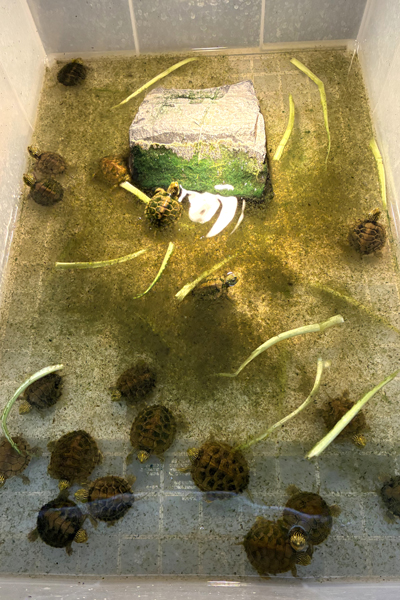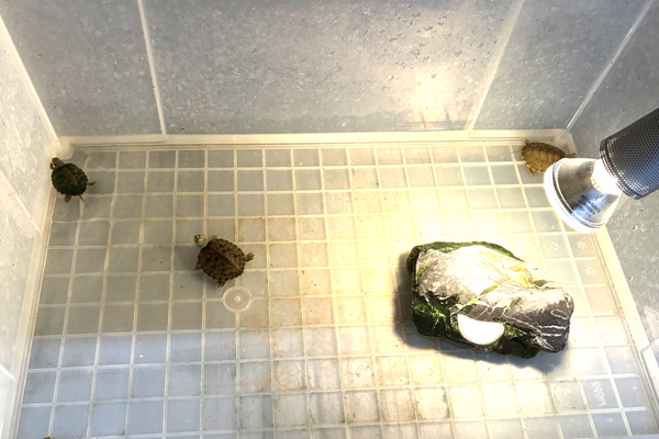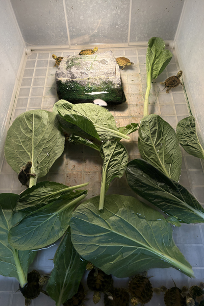 チズガメ属の飼育において最も重要なのが餌です。主なメニューは小松菜、人工飼料、昆虫などですが、最も多く与えるべきは小松菜です。小松菜の葉は常に水場に浮いているような状況で、毎日人工飼料を食べるだけ与えるのがベストです。 小松菜を与えることにより甲羅がカチっと丈夫に育ちます(水面に浮かぶ葉はシェルターにもなります)。こう言うと変に聞こえるかもしれませんが、彼らは“水の中のリクガメ”ぐらいの気持ちで育てるのが正しいです。ガンガン小松菜を与えましょう!