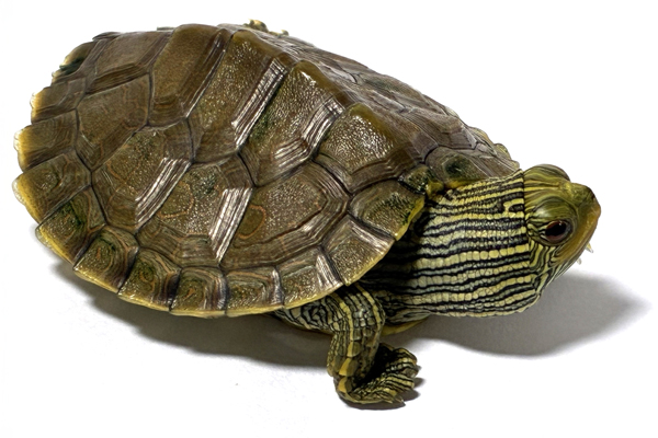 雄は甲長10〜15pですが、雌はより大きくなり18〜25pまで成長します(最大記録は27pとされています)。チズガメ属の中では甲羅は最も扁平で椎甲板に一本の弱いキールが入る程度です。 幼体時の甲羅はオリーブ色〜鼠色で各甲板にはうっすらと細い渦巻模様が入りますが、成長にともない灰褐色となり、模様も消失するものが多いです。しかしながら、後頭部の左右に一対ある長三角形〜楕円形の黄色い斑紋や、頸部や四肢に多数入る黄色〜黄白色の細いストライプ模様は成長しても残ります。 腹甲は黄色〜白色で各甲板の繋ぎ目が暗褐色に染まりますが、それ以外に目立つ模様はありません。
